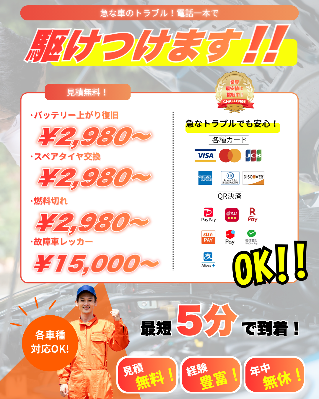 レッカー搬送、バッテリー上がり、パンク、鍵開け、燃料切れなど、急な車のトラブルはお任せください。