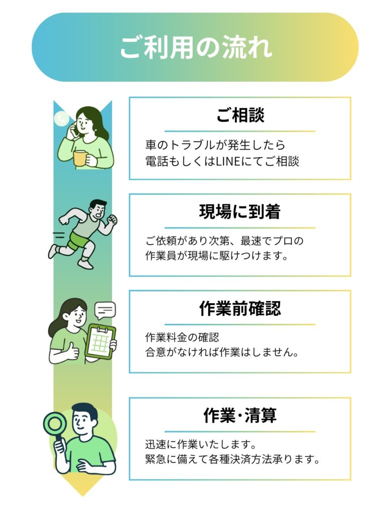 まずは状況をお伺いし、到着目安と料金をご案内したうえで、ご了承後に作業します。無料見積もりも可能です。